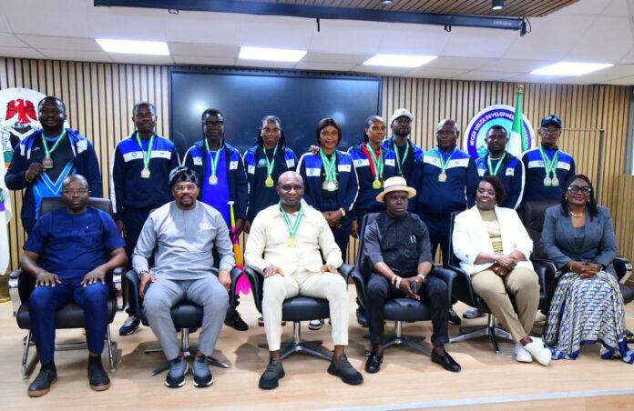 – The NDDC Managing Director, Dr Samuel Ogbuku (3rd left) seated with the Executive Director Finance and Administration, Alabo Boma Iyaye (2nd left); the Director, Human Resources, Mr. James Foyle (1st left);the Director Administration and Human Resources, Mr. Patrick Ekade (3rd right); the Director Finance and Supply, Mrs.Kunemofa Asu (2nd rigth); and the Director, Corporate Affairs, Mrs.Seledi Thompson-Wakama,during the reception for NDDC athletes at the 2025 Federation of public service games, at the Commission’s Headquarters in Port Harcourt.